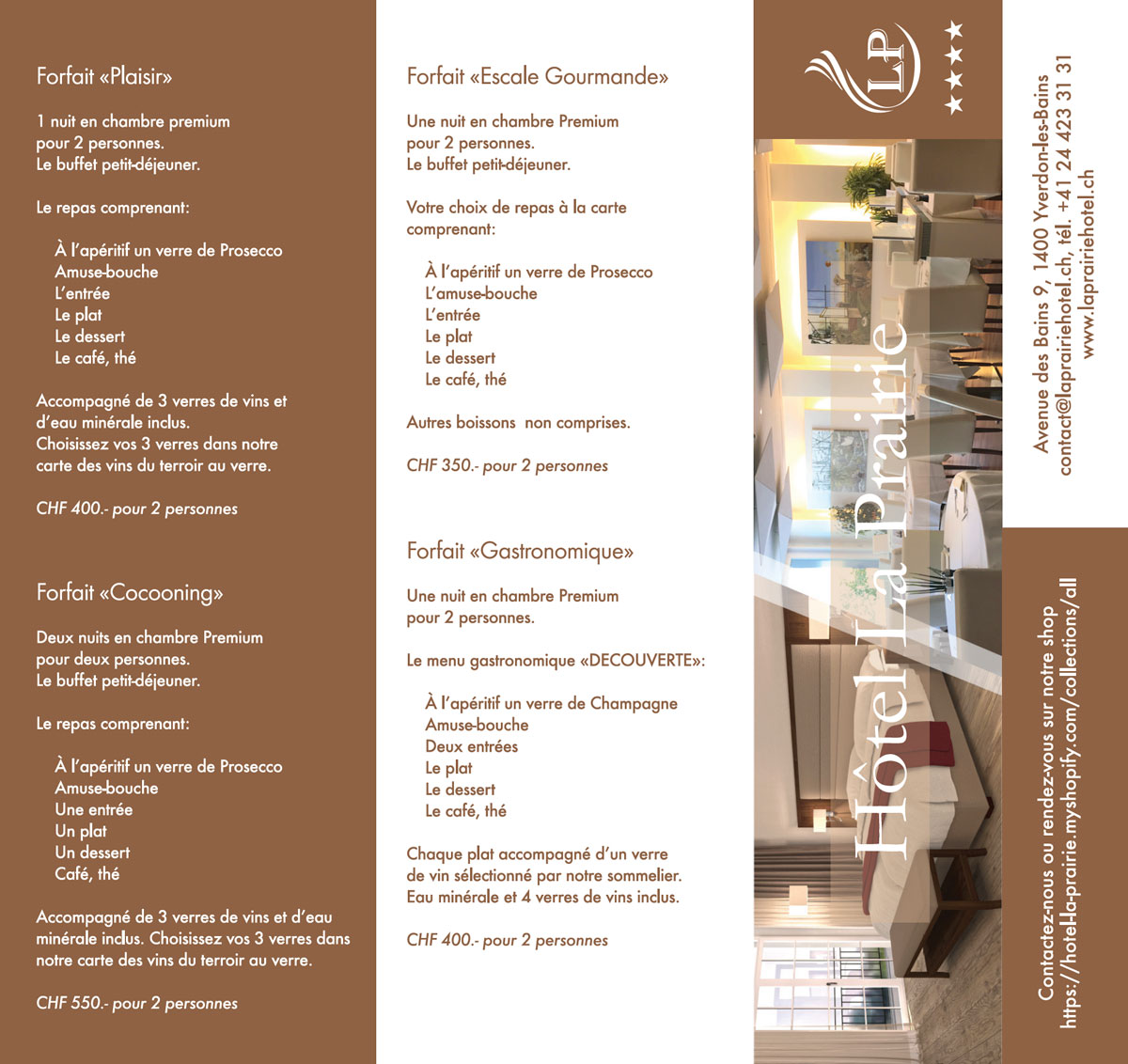 Dépliant en 3 volets décrivant l’hôtel La Prairie